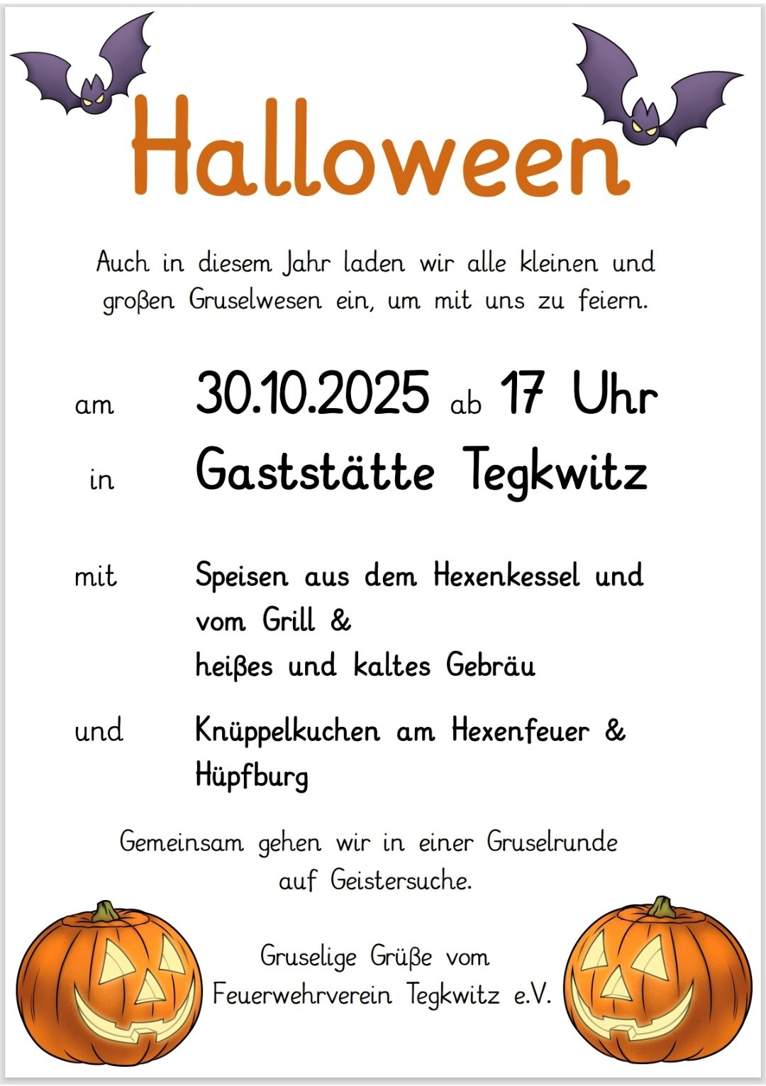 Am 30.10.2025 feiern wir mit groß und klein unser Halloweenfest am Sportplatz in Tegkwitz. Das gruselige Treiben startet