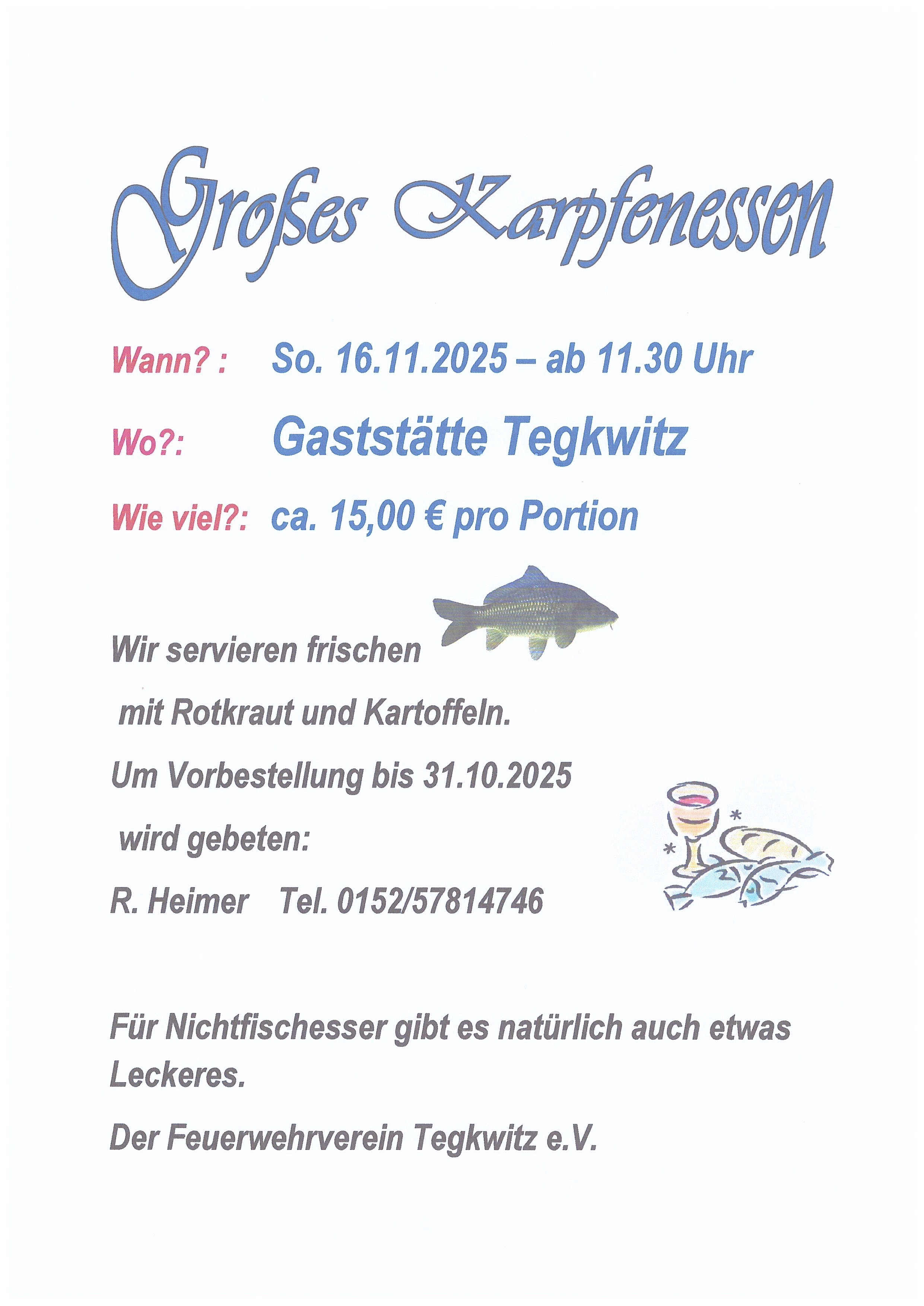 | Alle Freunde des Karpfenessens (und die es werden wollen) laden wir hiermit am 16.11.2025 ab 11.30 Uhr nach Tegkwitz in die Gaststätte ein. Wir bieten an diesem Tag frisch zubereiteten Karpfen mit Rotkraut und Kartoffeln an. Je Portion sind 15,00€ zu entrichten. Auch für Nichtfischesser gibt es eine leckere Alternative. Für eine gute Planung bitten wir um Vorbestellung bis zum 31.10.2025 bei Rainer Heimer unter 0152/57814746 oder unter r.heimer@tegkwitz.de. |